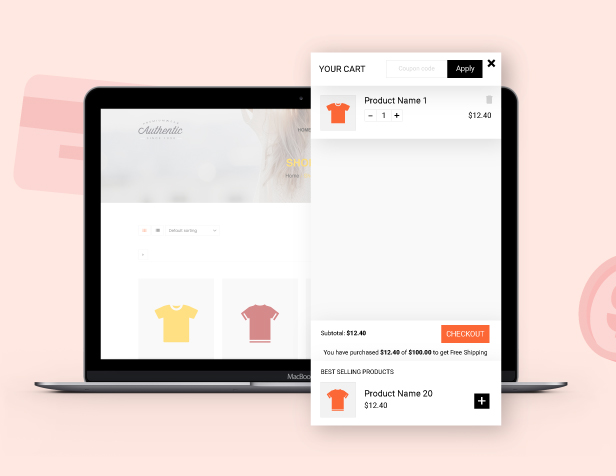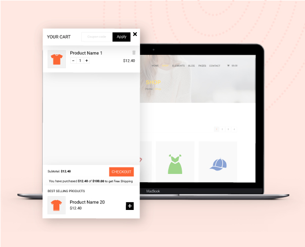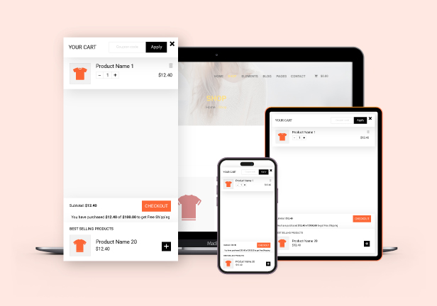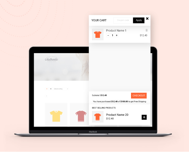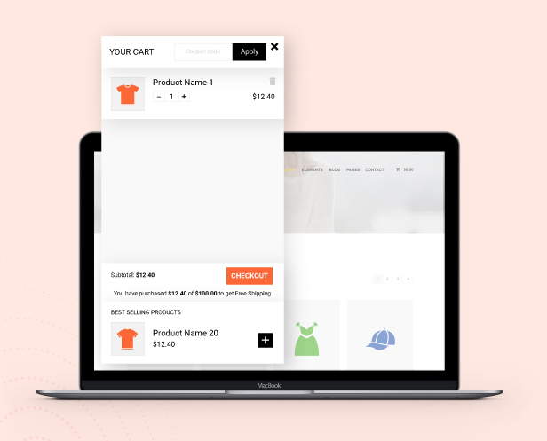 Display the Sidebar cart pop-up with all the features of the cart page. Customers can add coupons, select quantities, remove items, and go to the checkout page directly from the sidebar cart with just one click checkout WooCommerce. This option helps to reduce the checkout time and increase the conversion rate of your store.