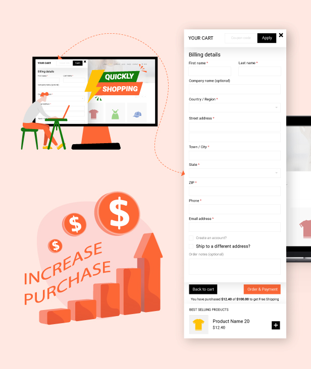 With the plugin, Checkout steps are integrated into the Sidebar Cart. Customers can checkout directly on the sidebar cart without going to the checkout page. The one click checkout WooCommerce feature will encourage the customers to complete their orders quickly and boost your sales.